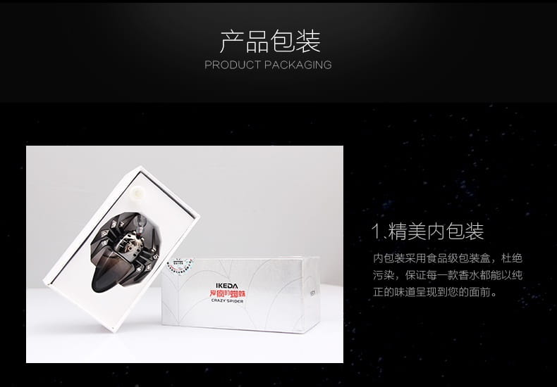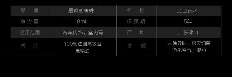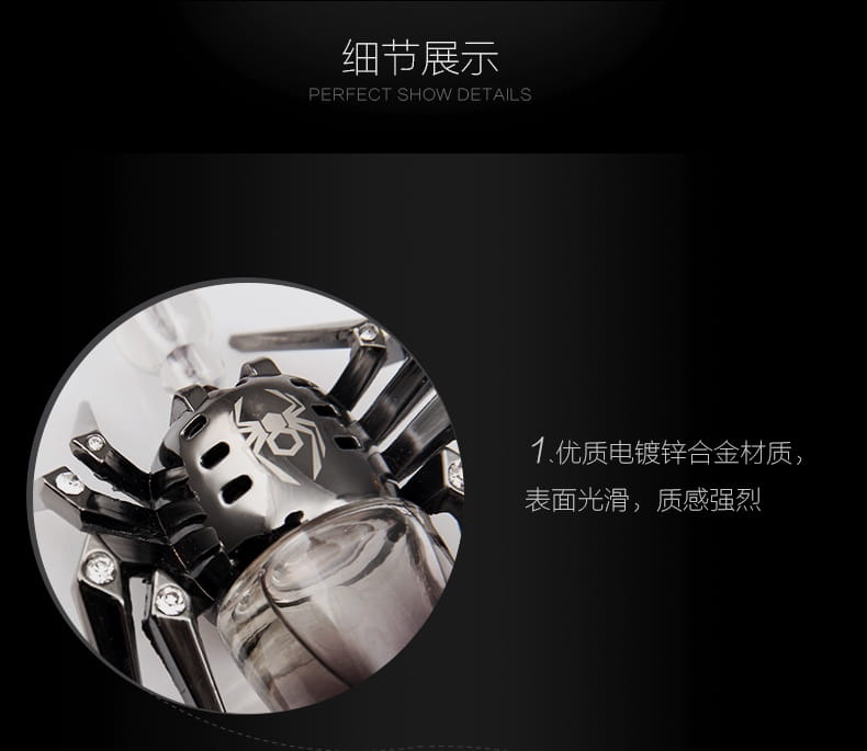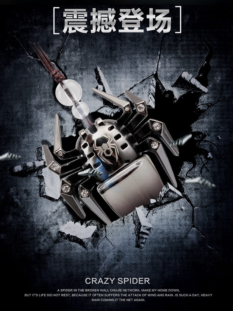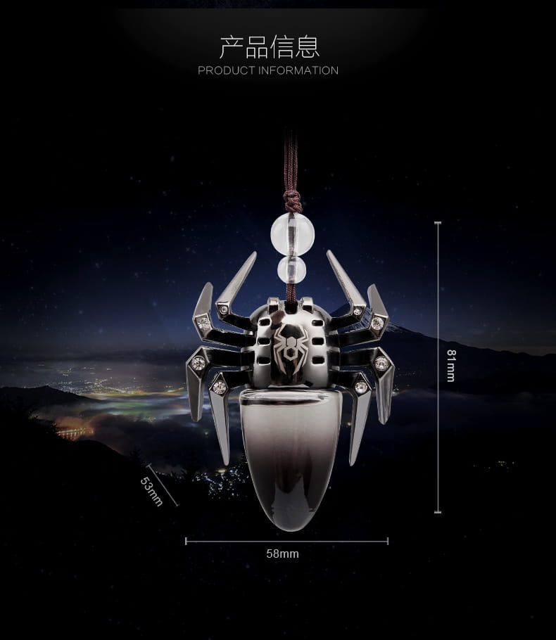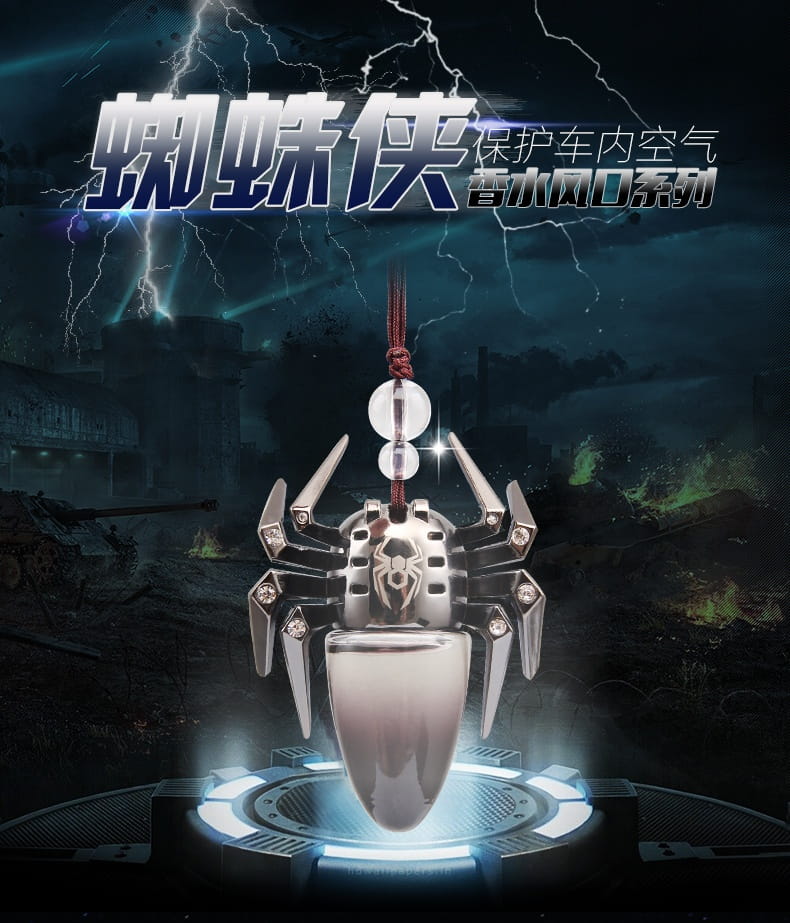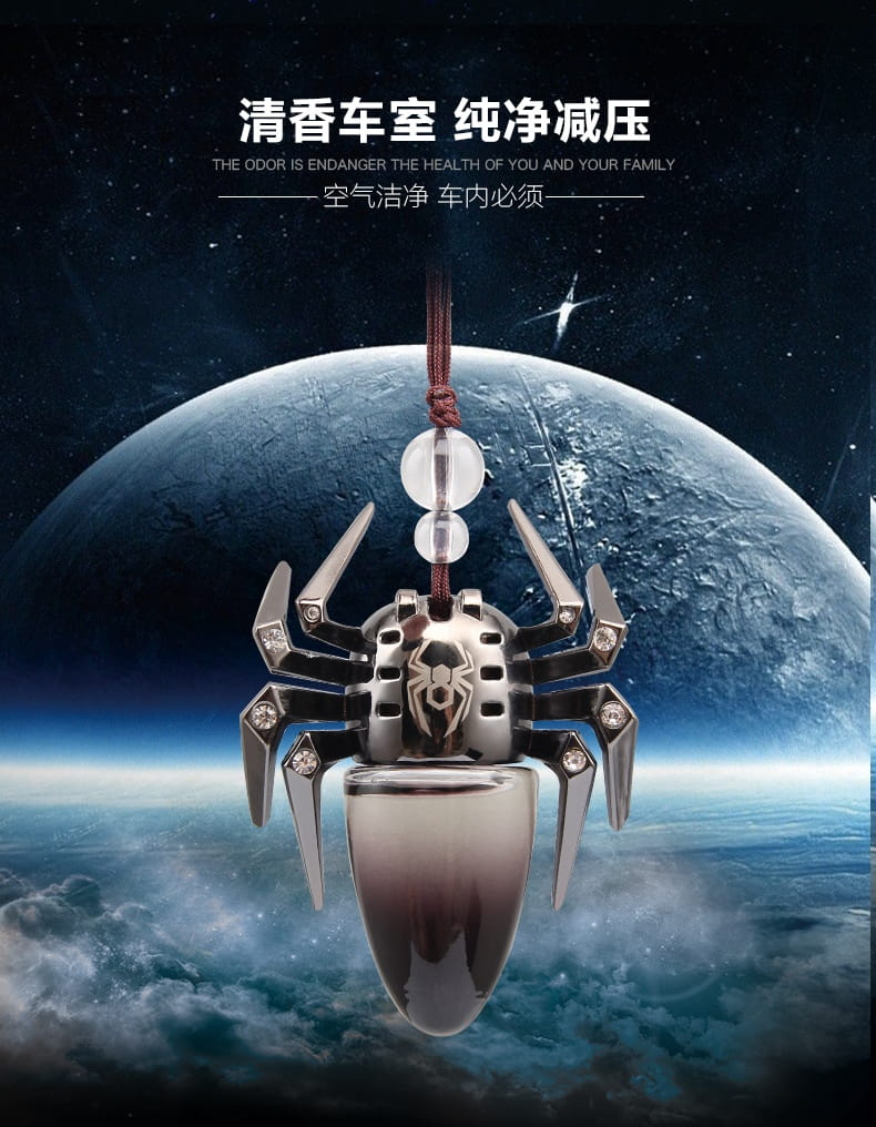 產(chǎn)品特點:1、蜘蛛個性張揚的造型配以繩子,寓意積極向上;2、高檔鋅合金 富有質(zhì)感金屬光澤,有份量,有手感,更顯身份與價值;3、鑲嵌8顆進(jìn)口比利時安特衛(wèi)普鉆,光澤透亮,閃耀迷人;4、香精100%法國進(jìn)口,香味獨特迷人,持香時間長,質(zhì)量有保證;5、品牌專利產(chǎn)品,只此一家;6、可懸掛于車內(nèi)、衣柜、臥室、浴室以及辦公室,芳香除臭抑菌,更是賞心悅目的美麗風(fēng)景。