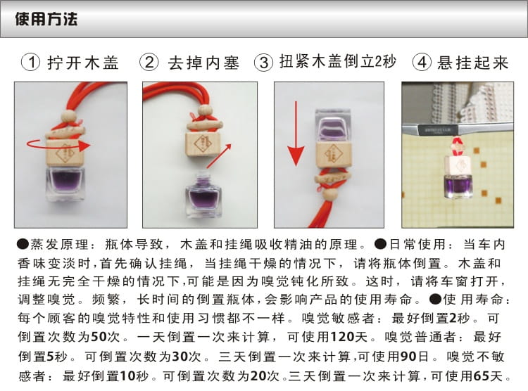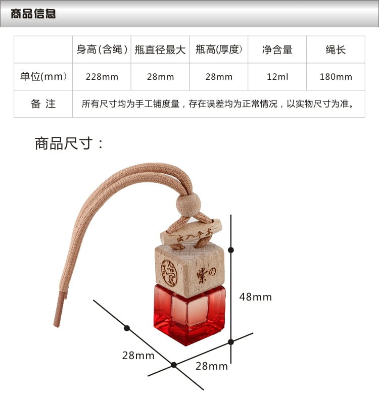 產品特點:紫檀香元吊飾汽車香水掛件是一種時尚的汽車香水掛件,可以當作飾品,也可以祛除汽車內、室內的嗅味、異味,消滅細菌,凈化空氣,營造清新可人的香氛,提神爽氣。