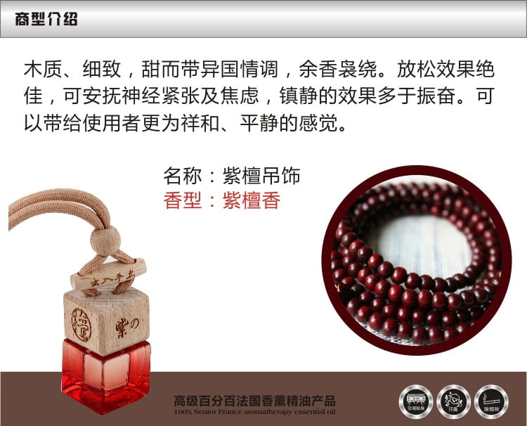 紫檀香元吊飾汽車香水掛件是一種時尚的汽車香水掛件,可以當作飾品,也可以祛除汽車內、室內的嗅味、異味,消滅細菌,凈化空氣,營造清新可人的香氛,提神爽氣。